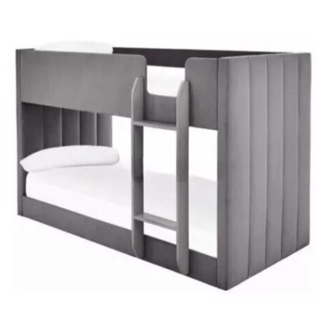 Part of our brand-new MoonSleepBeds Kids Collection, this upholstered bunk bed blends child-friendly safety with timeless style. Built to comply with UK safety regulations, it features a secure left-side ladder, full-length...