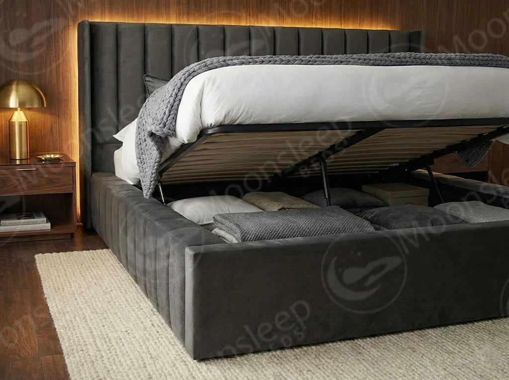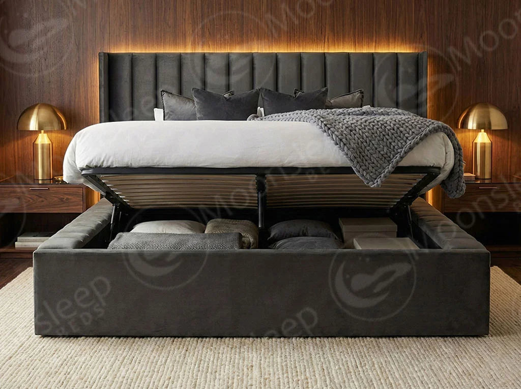 We provide the option of a practical gas lift storage system. By gently pulling the handle, the mattress effortlessly lifts, revealing ample storage space underneath. This clever design does not compromise the bed's appearance and offers a convenient solution for creating additional storage. We do also provide the options to add draws underneath the bed (add up to 4 draws, 2 on each side).